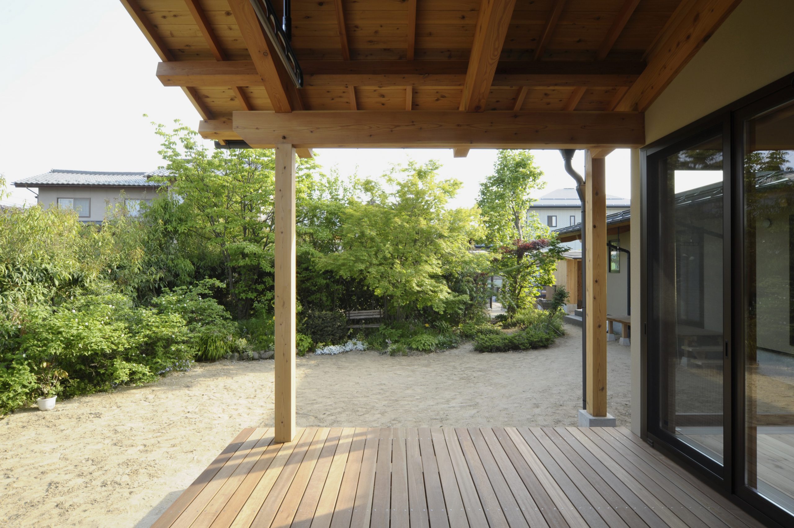庭を楽しむために、屋根付きテラスを設けました。食事やお茶をしたり、洗濯物を干したり、生活の一部として豊かな時間が生まれます。